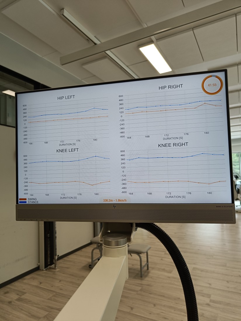 Indigon tavoin myös Lokomat reagoi spastisuuteen.: Kun se luulee kohonnutta spastisuutta spasmiksi, se pysähtyy turvallisuusasetusten vuoksi. Laite saadaan kyllä nopeasti uudelleen käyntiin, mutta asiakas täytyy ensin nostaa ilmaan ja tietyt asetukset, kuten painokevennys ja maton nopeus, on säädettävä uusiksi. Tämä vie aikaa treeniltä. On hyvä, että laite reagoi lihassäpsyihin, mutta se on kohdallani asteen turhan herkkä. Kuten sanottua, pystyn korkeasta lihasjänteydestäni huolimatta kävelemään laitteella siten, että se avustaa liikettä kohtuullisen pienesti. Kuitenkin mitä pienempi laitteen tarjoama tuki on, sitä herkemmin se reagoi esimerkiksi puhumiseeni. Kun puhun, tuppaa lihasjänteyteni nousemaan. Laite tulkitsee sen spasmiksi. Ihan kamalan jäykälle ihmiselle laite ei siis välttämättä tarjoa parasta mahdollista hyötyä. Toisaalta, liike voi auttaa myös murtamaan voimakasta spastisuutta ja harjoittelun myötä spastisuuden määrä ja spasmit vähenevät.